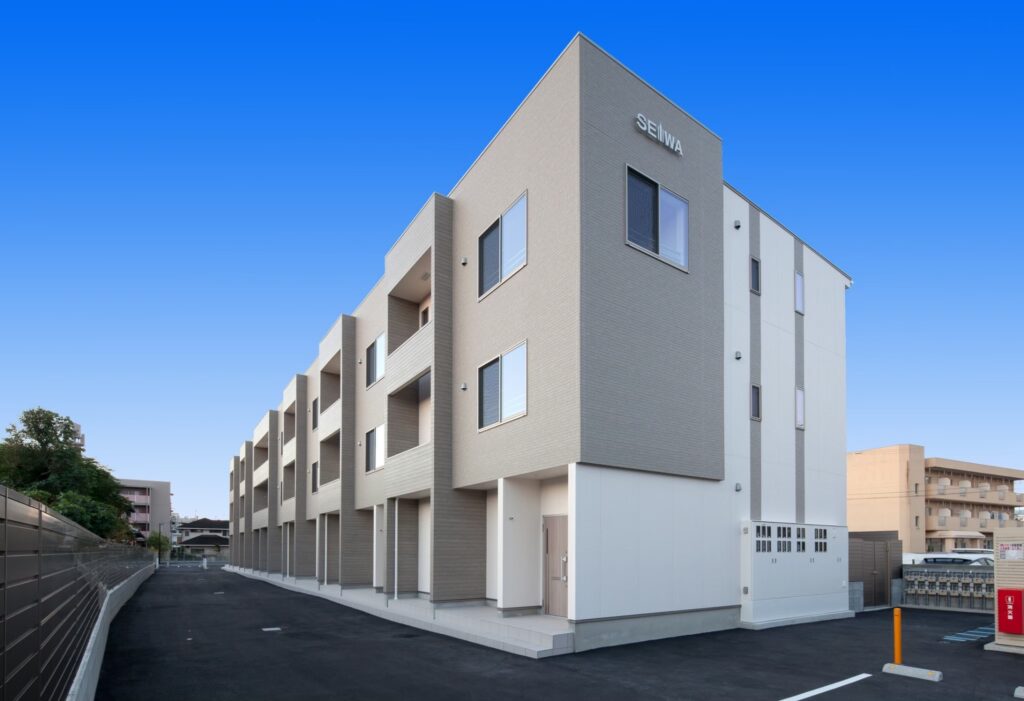 所在地 佐賀県佐賀市延床面積 1,266.49㎡構造 木造規模 地上3階建間取り 1LDK×7戸 2LDK×14戸用途 共同住宅