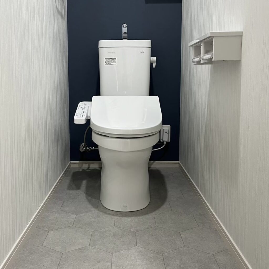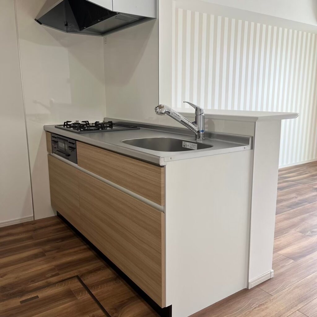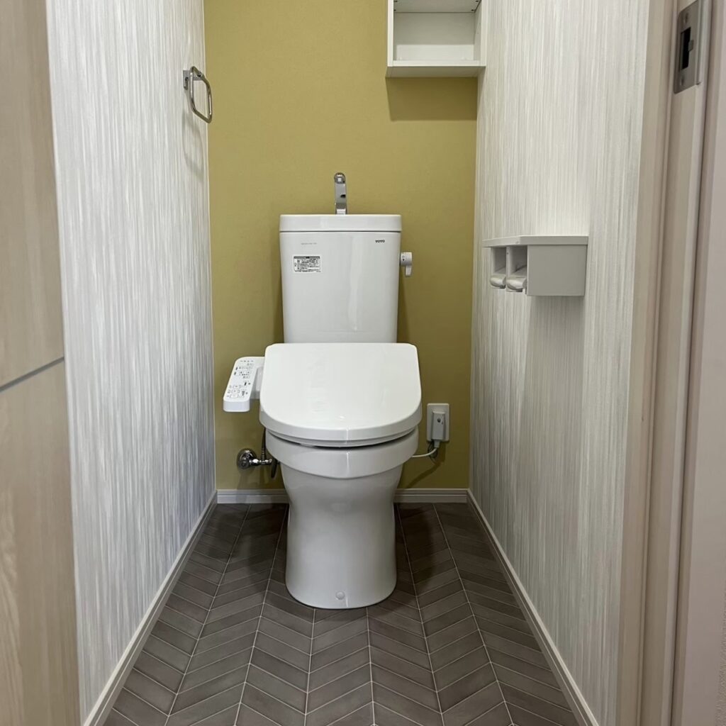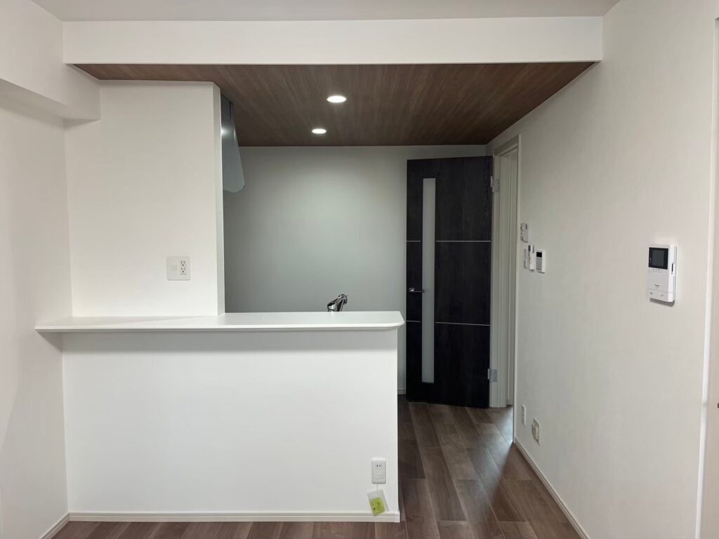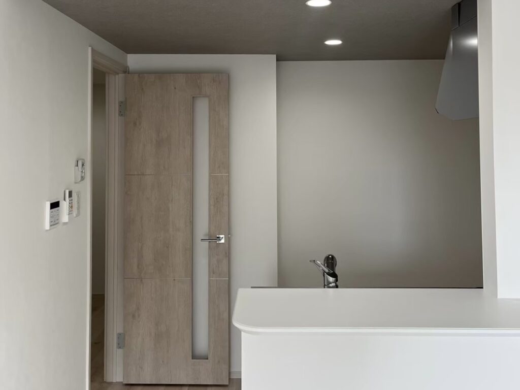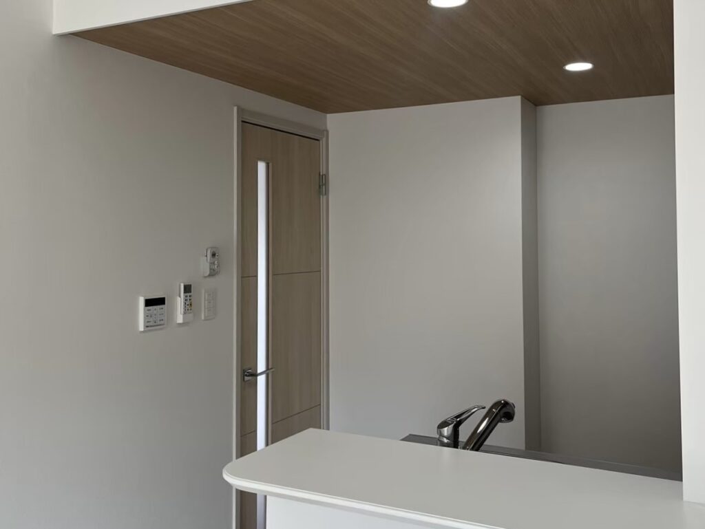 クロスなどの色味を落ち着かせることで建具や設備のダーク色がアクセントに。