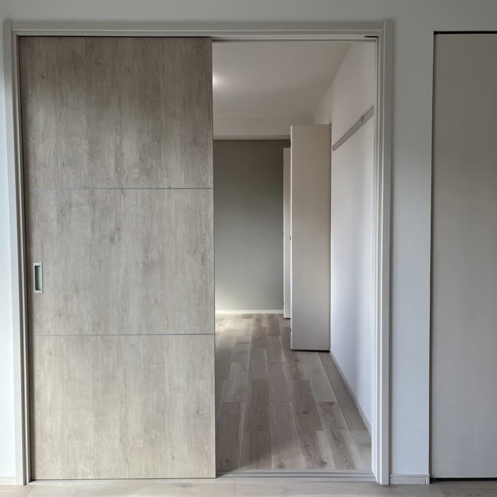 木目柄が喧嘩しないように建具をホワイトでまとめる。
