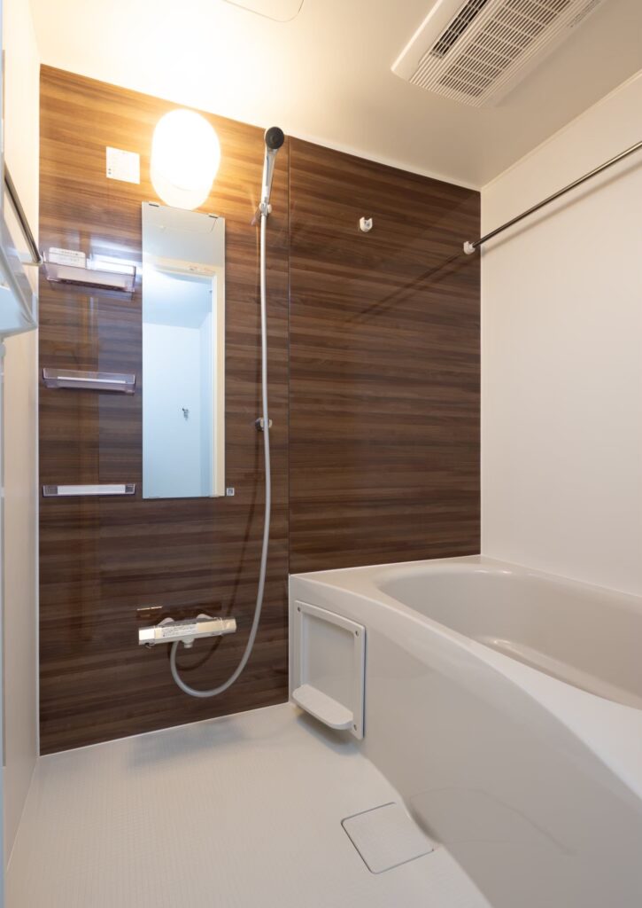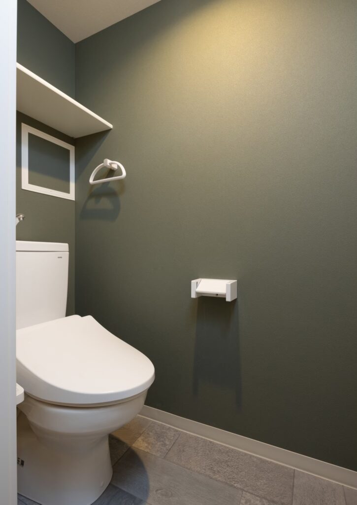 アクセントに、タイル色に合わせたルーバー間接照明を設置。