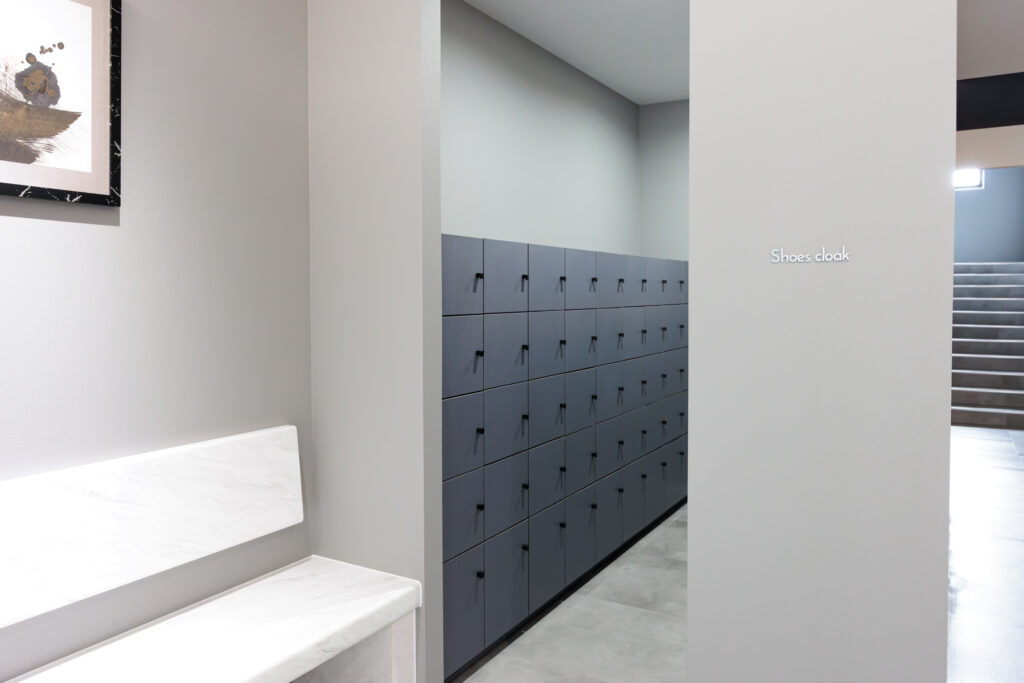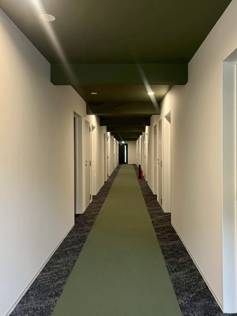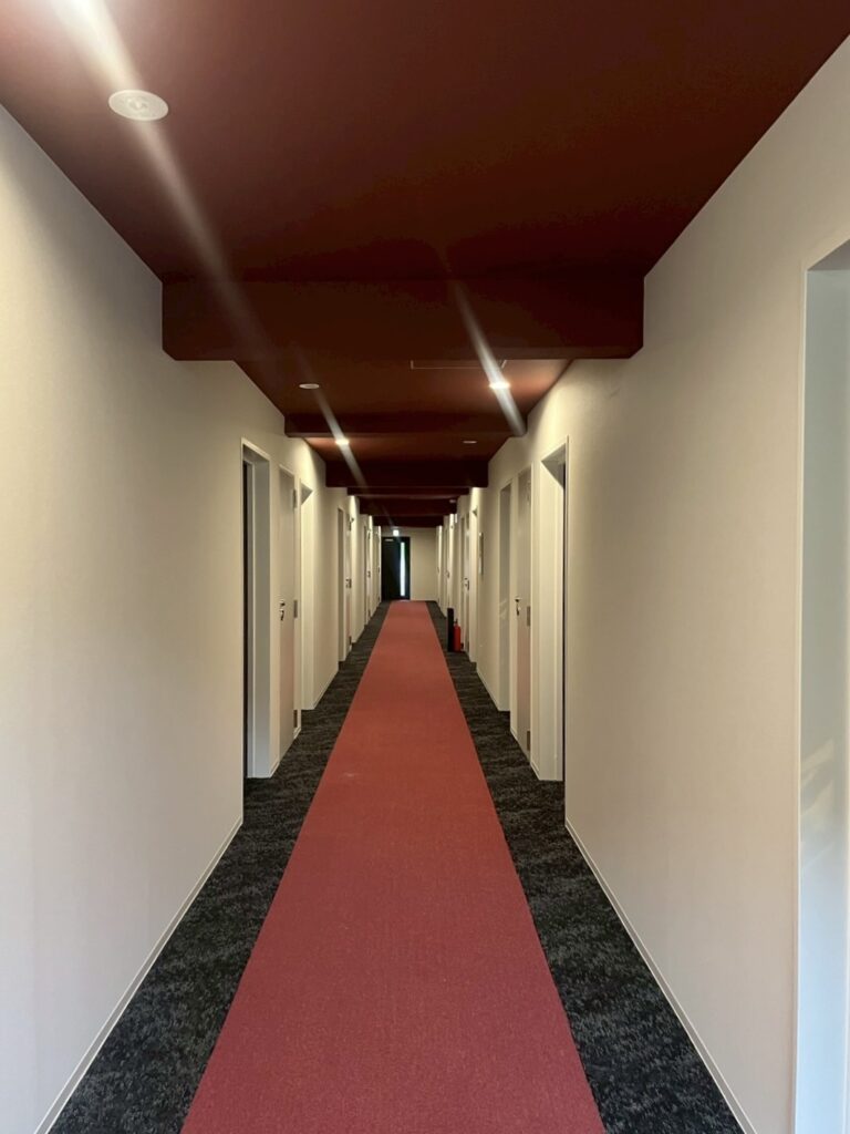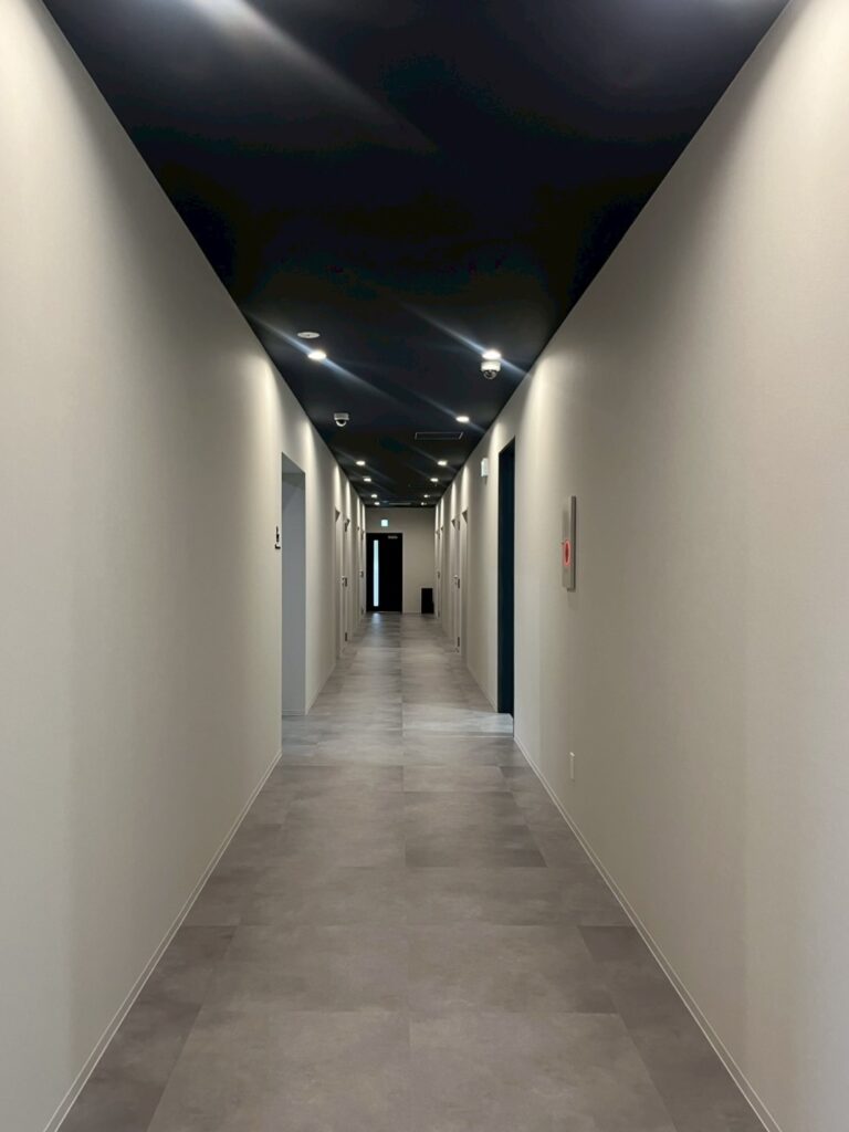 1階は個室の他に食事室や娯楽室などの共有部があるため、床は大理石で統一。天井にテーマカラーを使用。