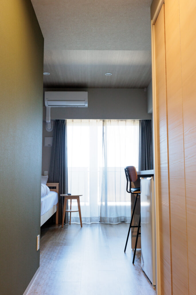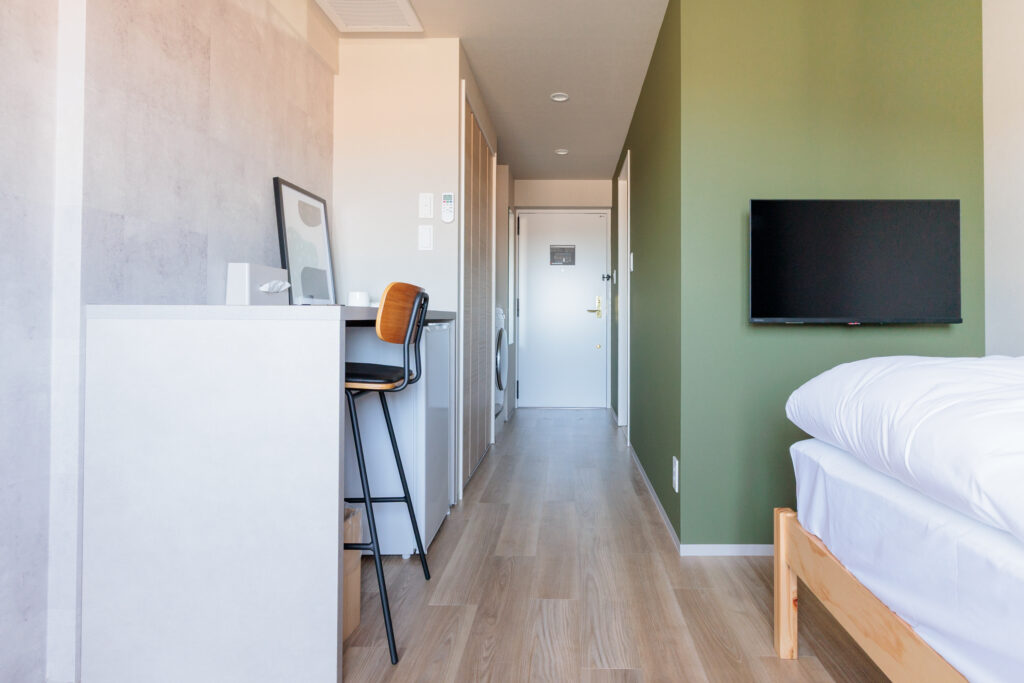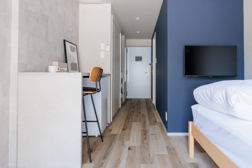 フロアごとに異なるアクセントカラーに合わせて床材やクローゼット扉なども選定。ホテルの小さな部屋だからこそ、同じ間取りでも入った瞬間の印象が大きく変わる。