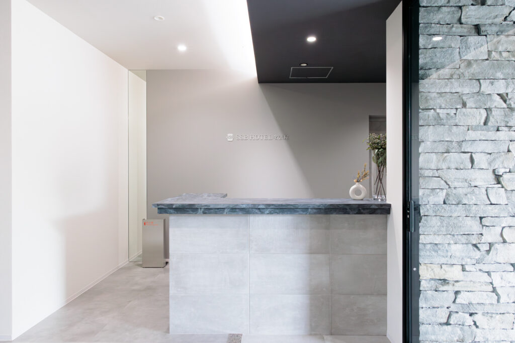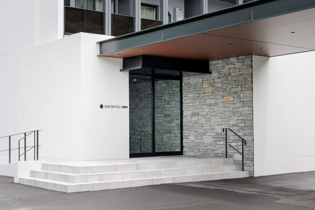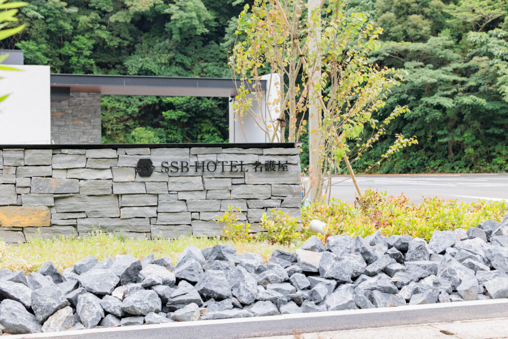 敷地入り口のサイン看板との統一感の演出で、入口からホテルの雰囲気を作る。